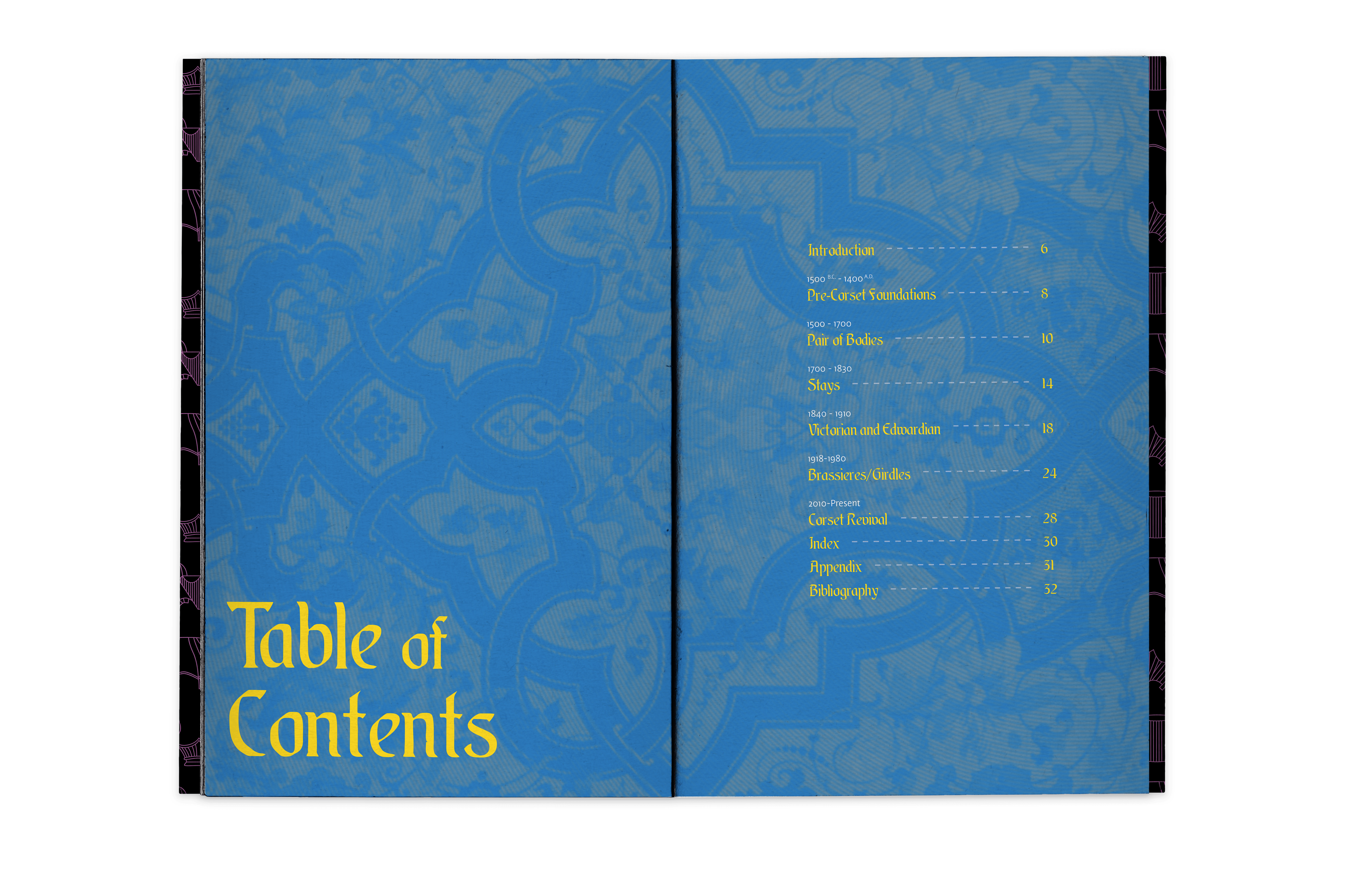 An editorial encompassing the history of corsetry, from girdles in 1500 BC to the modern resurgence of them in fashion. It was created using a combination of original images as well as images of extant garments and textiles compiled from various online sources.
